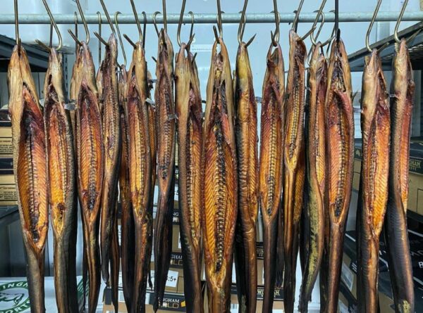 “The eels are purged for several to clear any muddy impurities, and then we brine them in a mix of salt, treacle, and water for two days. Then we dry them for a day or two in a drying fridge, and hot smoke them really gently over hickory for 10 hours.”